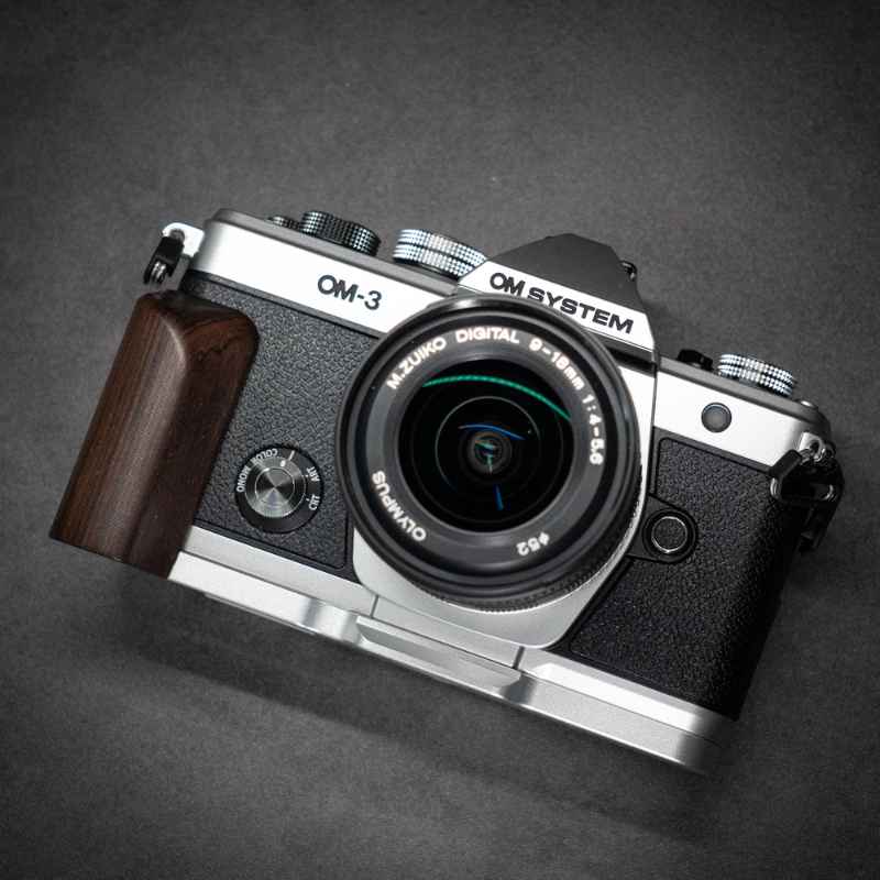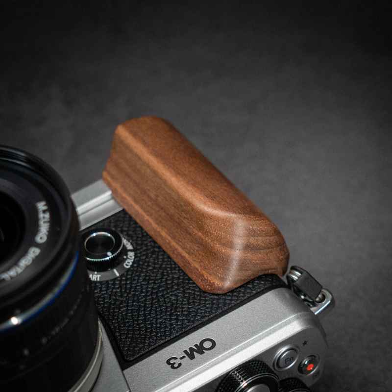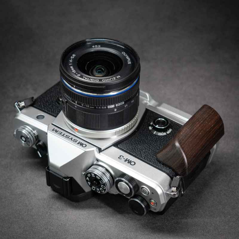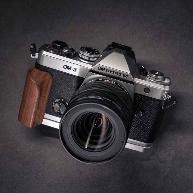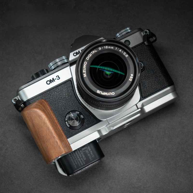 What are the advantages of selecting a wooden grip for your OM3 camera?